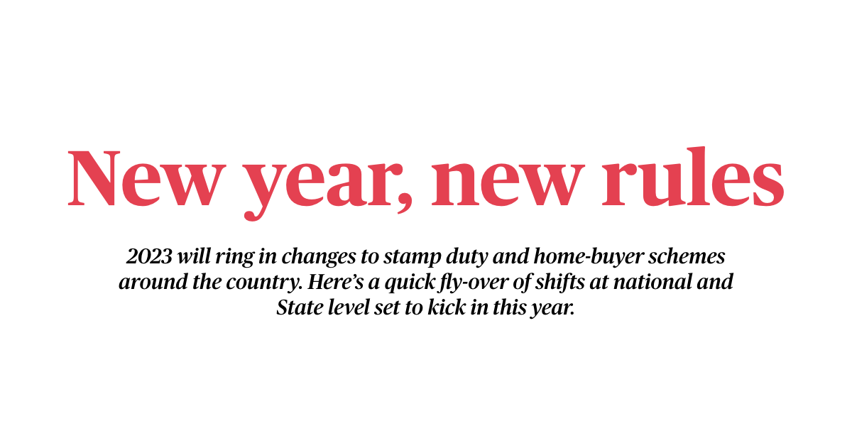 2023 will ring in changes to stamp duty and home-buyer schemes around the country. Here’s a quick fly-over of shifts at national and State level set to kick in this year.